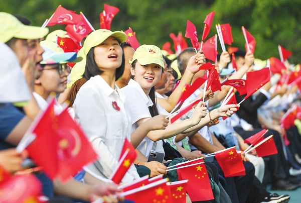 9月3日,纪念中国人民抗日战争暨世界反法西斯战争胜利80周年大会在北京隆重举行。图为观众在天安门广场挥舞国旗。